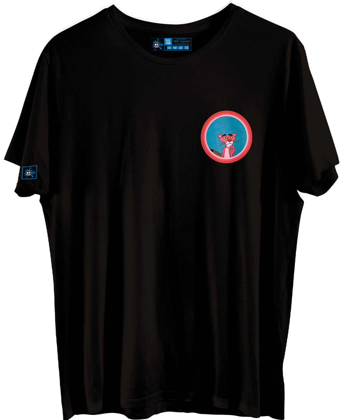 Un diseño único que combina minimalismo en la parte frontal (con el clásico círculo azul y la icónica pantera) y un estampado llamativo en la parte trasera con la figura completa y el logo Pink Panther en efecto neón.